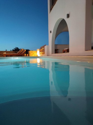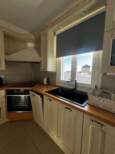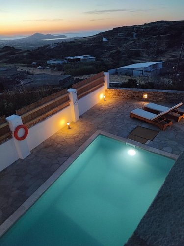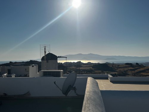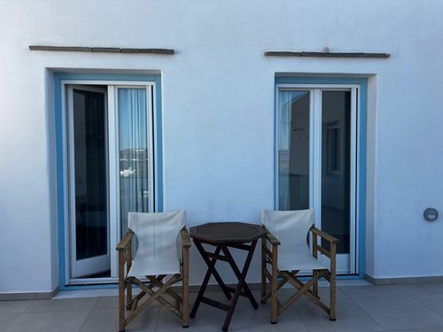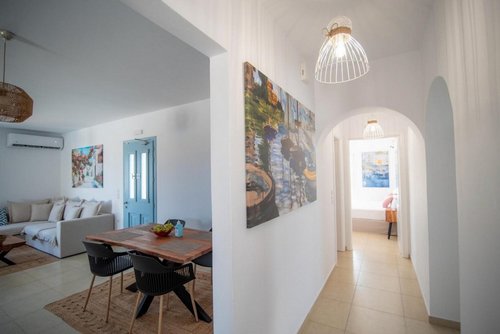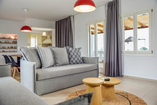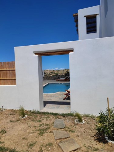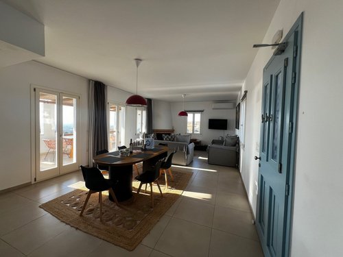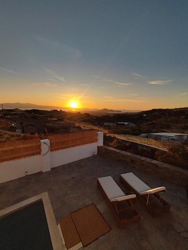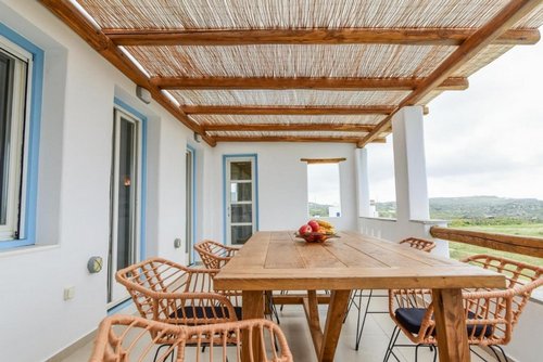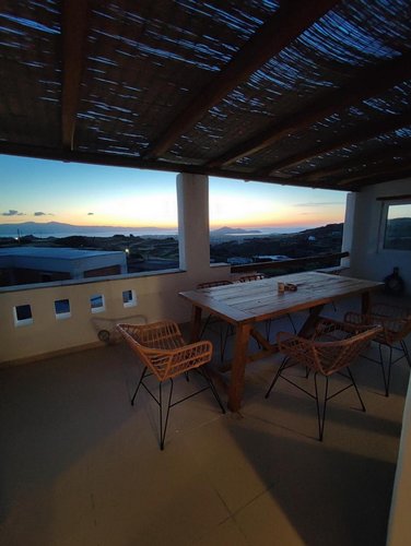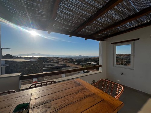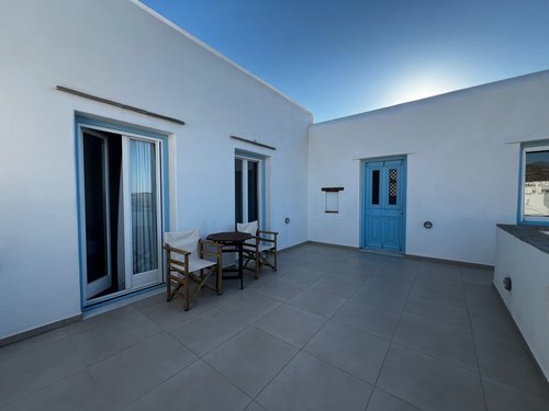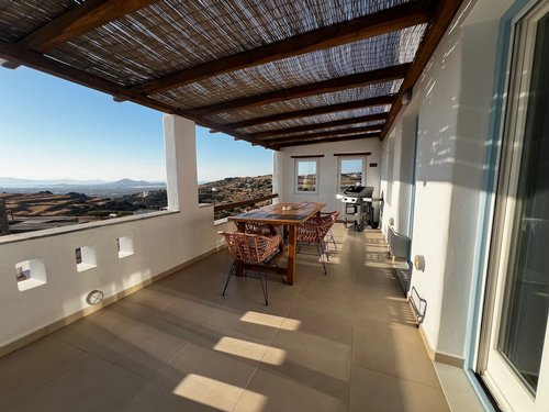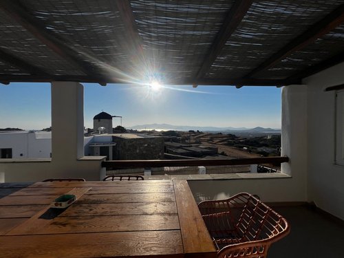 Πρώτος Όροφος (110, 51 τ.μ.): Μια εσωτερική μαρμάρινη σκάλα οδηγεί στον όροφο της απόλαυσης. Εδώ θα βρείτε δύο υπνοδωμάτια, ένα μπάνιο και ένα βοηθητικό, αλλά η καρδιά του ορόφου χτυπάει στη σκεπαστή βεράντα. Με καλαμωτή και απεριόριστη θέα στον παραδοσιακό μύλο, αποτελεί το ιδανικό σημείο για να απολαύσετε το πρωινό σας, το μεσημεριανό σας ή το ποτό σας, βιώνοντας ένα από τα πιο μαγευτικά ηλιοβασιλέματα του Αιγαίου.
